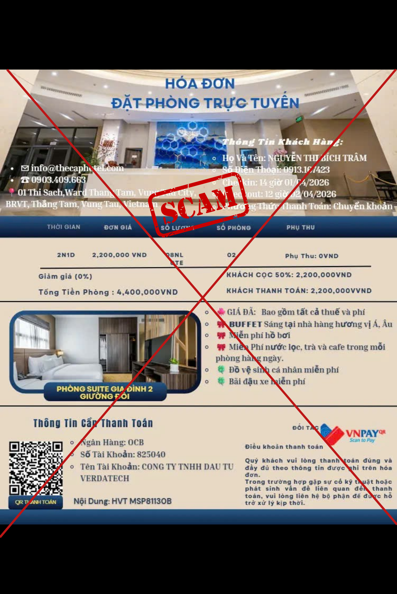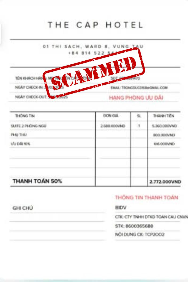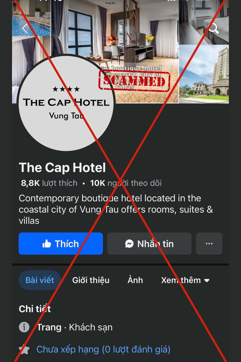 Hiện nay có một số trang facebook giả mạo đang sử dụng tên và hình ảnh của The Cap Hotel nhằm mục đích lừa đảo, thu thập thông tin cá nhân hoặc yêu cầu thanh toán không hợp lệ.